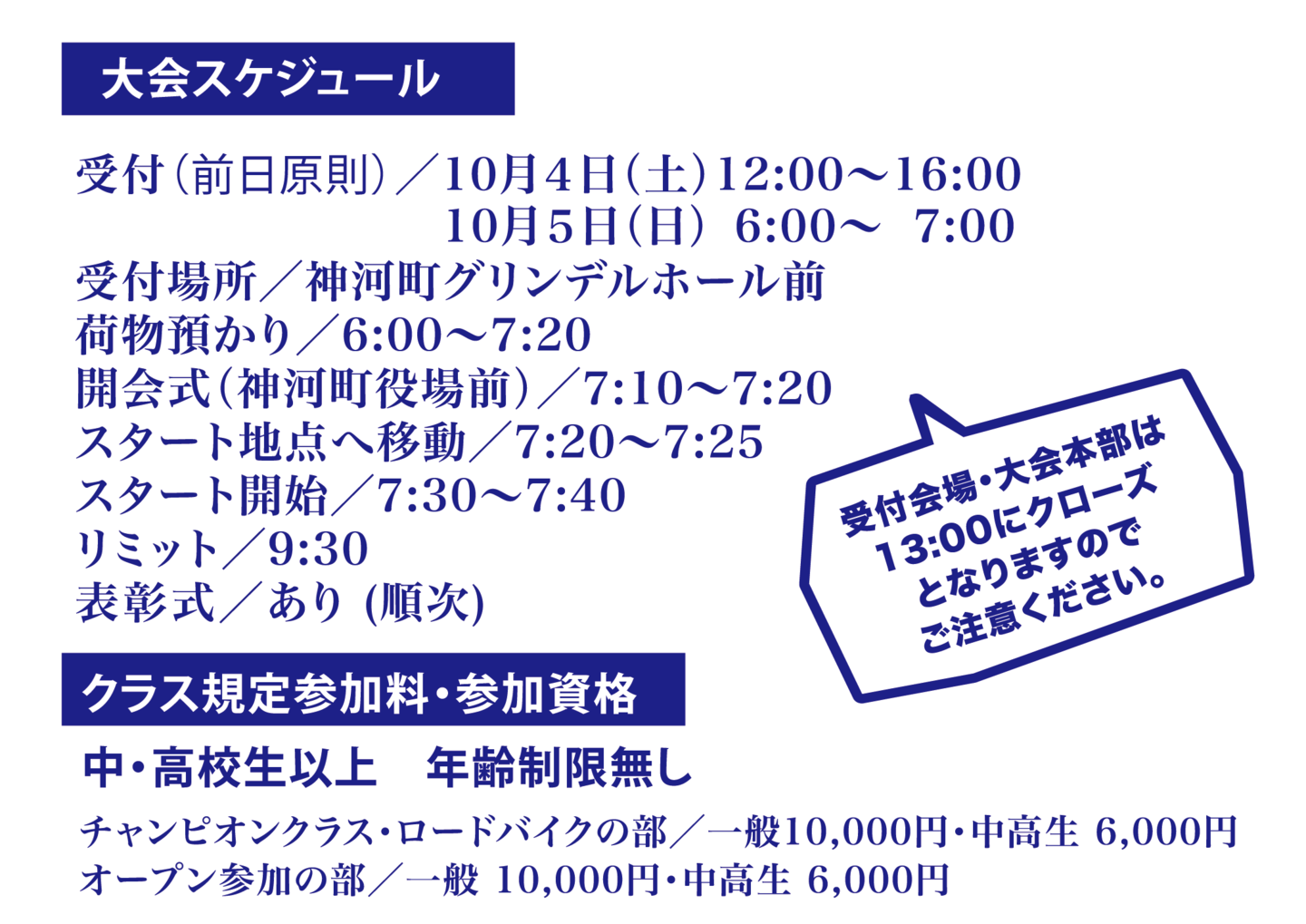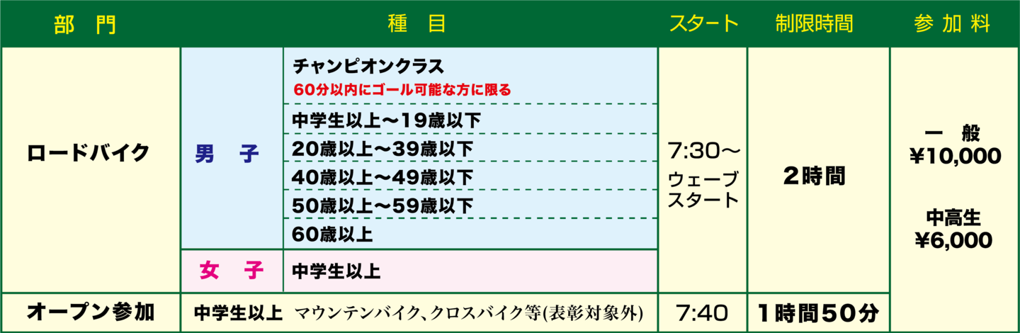 どの部門とも、ピストバイク、タンデム車、電動アシスト自転車は使用不可。ブルホーンハンドル、DH