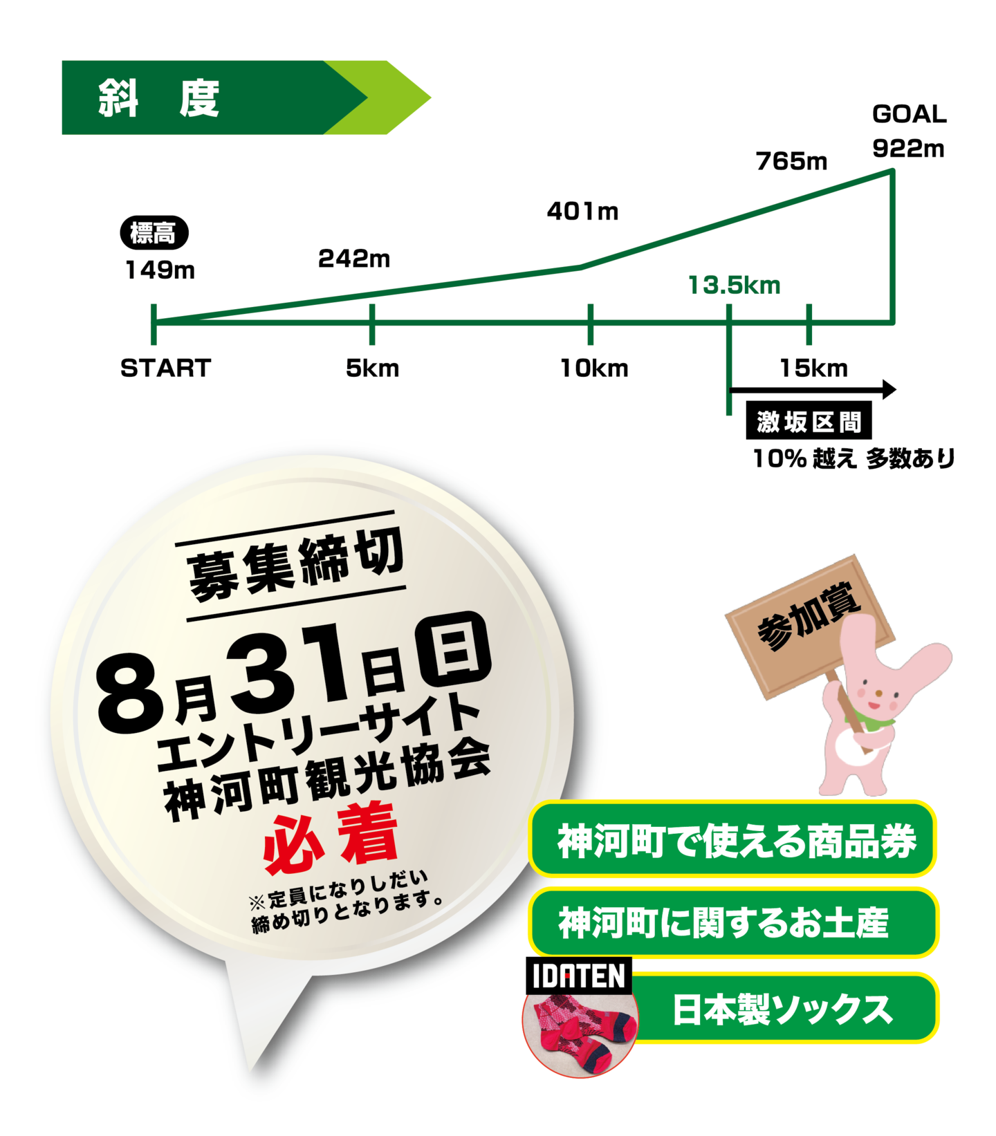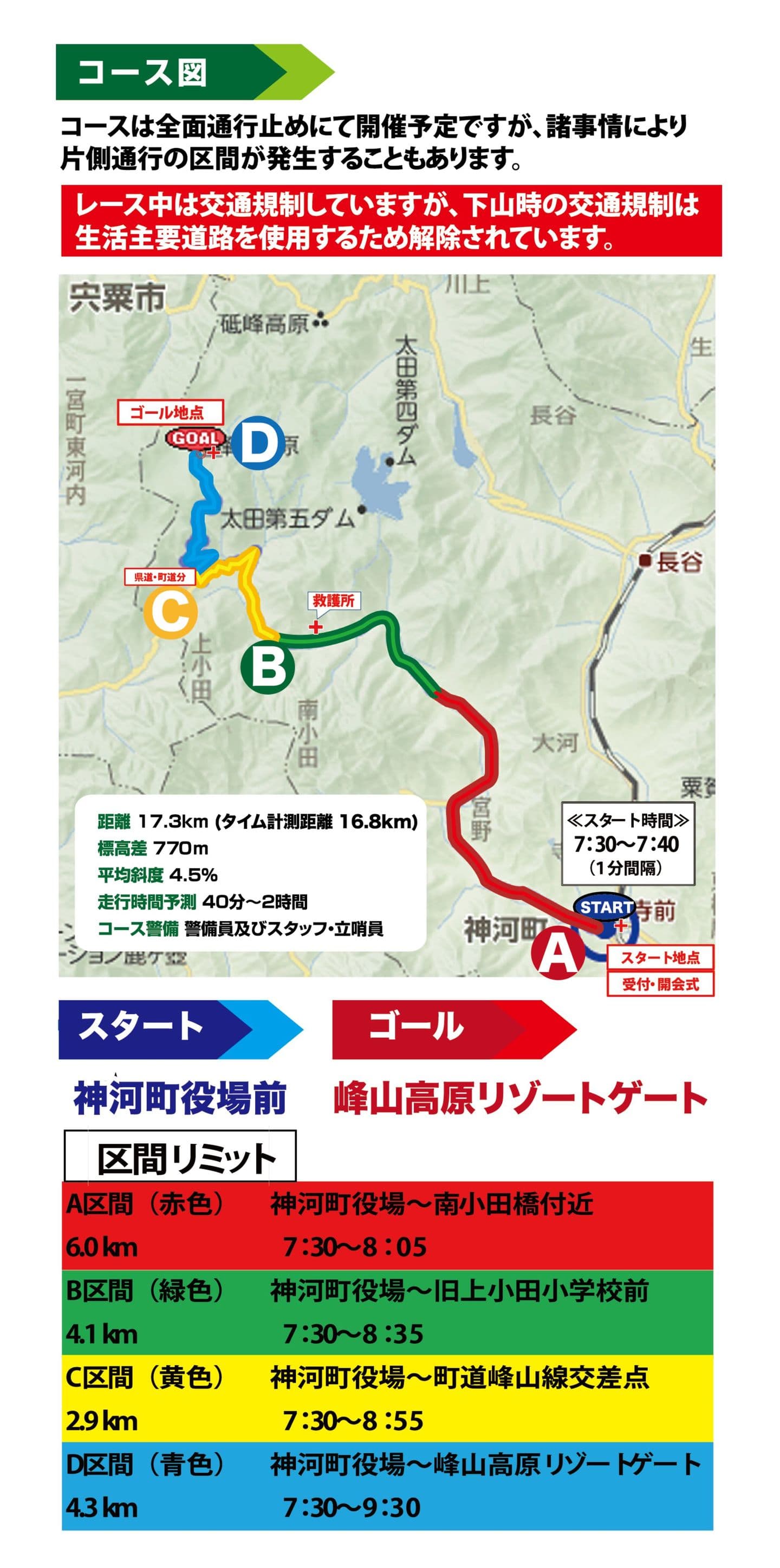 ■開催概要:神河町役場から峰山高原リゾート グリーンピークまでの距離約17.3km、標高差約773mの走行時間を競います。